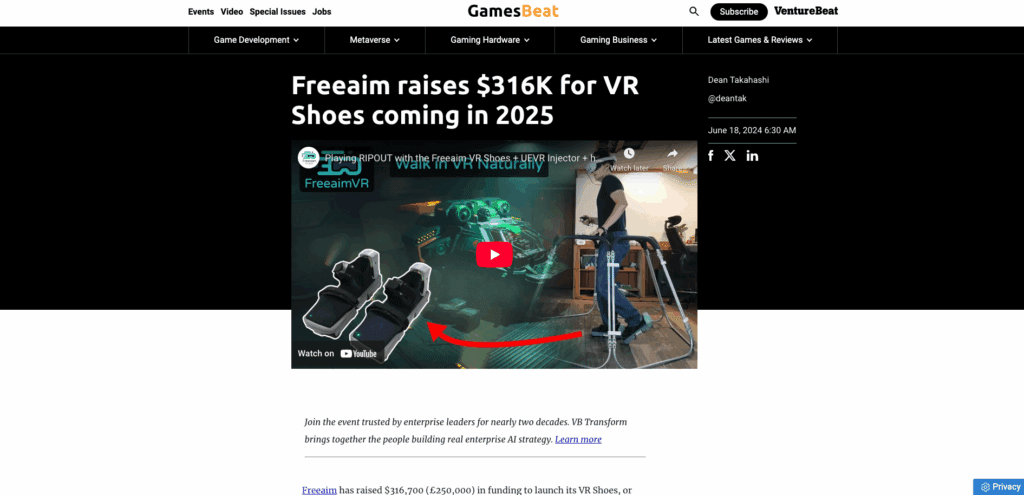 - VentureBeat exclusive (Gamesbeat):“Freeaim raises $316K for VR Shoes coming in 2025”