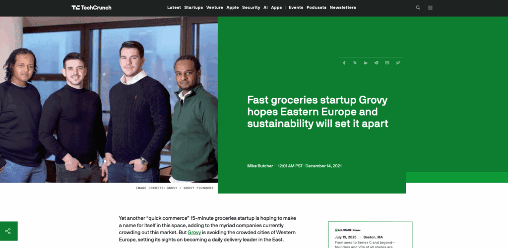 We got our her piece TechCrunch exclusive: “Fast groceries startup Grovy hopes Eastern Europe and sustainability will set it apart”, written by: Mike Butcher.