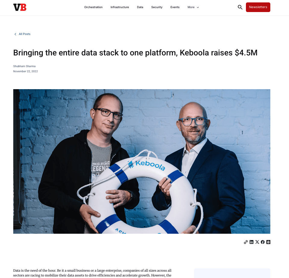 VentureBeat was a clear target for Keboola and our pitch landed. The publication published a dedicated hero article. We also ran a wider international outreach to 20+ carefully selected publications on embargo lift day, covering the data, tech, startup, and CEE media verticals. The team supported Keboola throughout with a social media amplification playbook, helping the founders and investors turn the announcement into a sustained, multi-day conversation online.