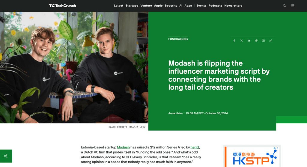 Modash, the Estonian creator partnerships platform trusted by brands like Birkenstock, Victoria’s Secret, and Farfetch, approached us to announce their $12M Series A led by henQ VC.